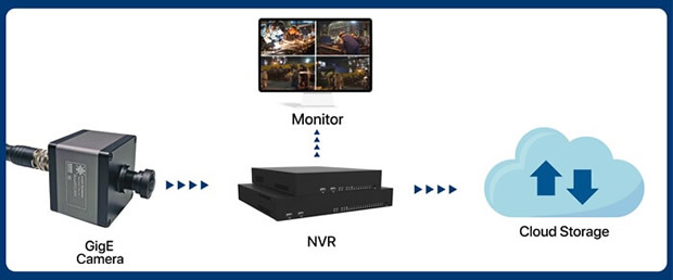 The camera can transmit video streams to a centralized NVR located elsewhere, which then distributes the video feed to monitors. The NVR integrates with Cloud storage. The data stored in cloud storage can be accessed anytime.